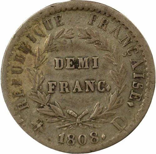 Pièce France Napoléon I - 1/2 Franc Argent, Tête laurée, République - 1808 D Lyon