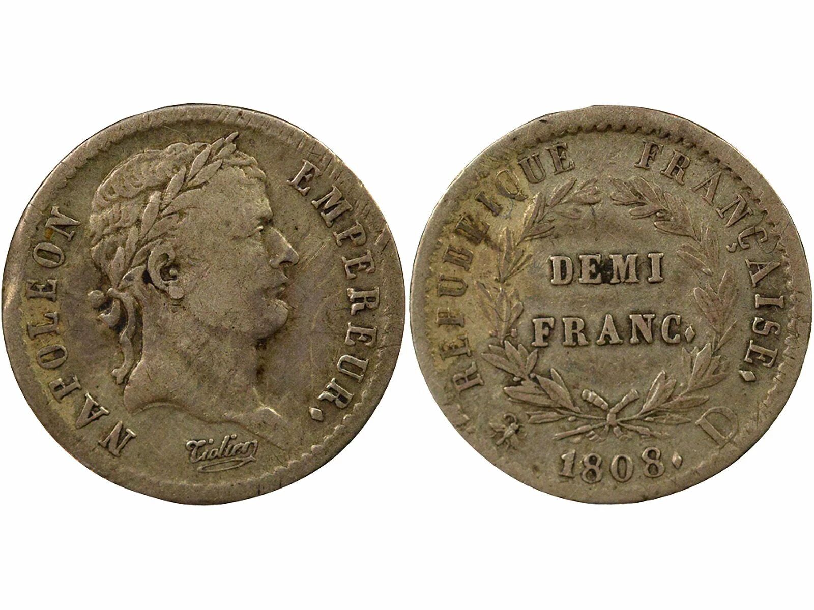 Coin France Napoleon I - 1/2 Silver Franc, Laureate Head, Republic - 1808 D Lyon