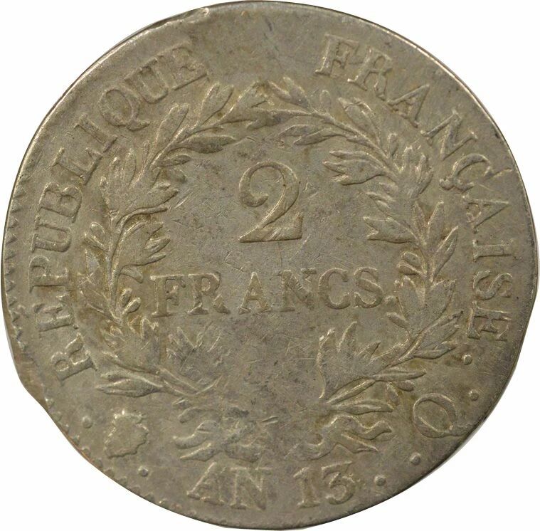 Accueil > Monnaies françaises (470 à 2002) > Monnaies Modernes (1789 à 2002) > 2 francs > France Napoléon I - 2 Francs Argent, Cal. Révolutionnaire - An 13 Q Perpignan