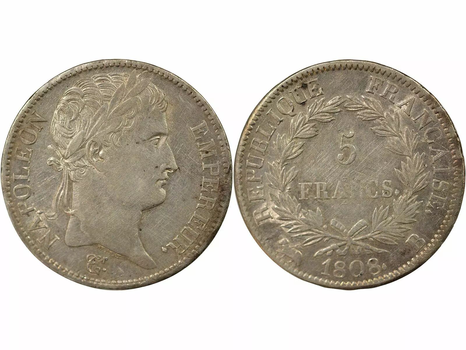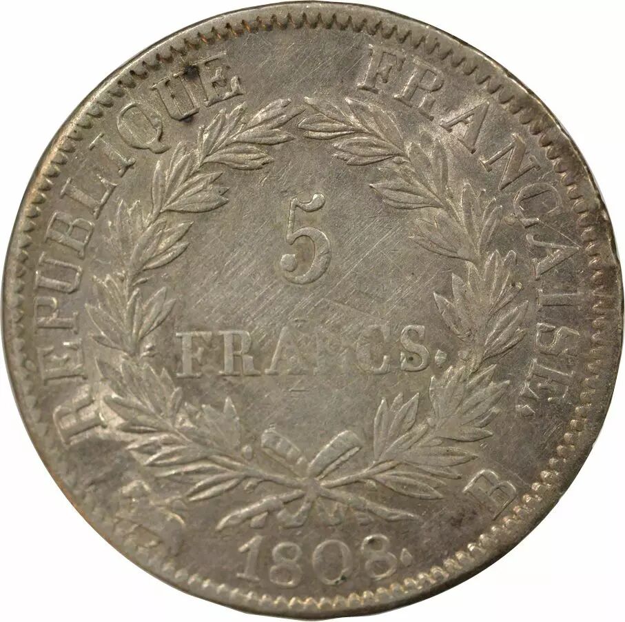 Pièce France Napoléon I - 5 Francs Argent, Tête laurée, République - 1808 B Rouen