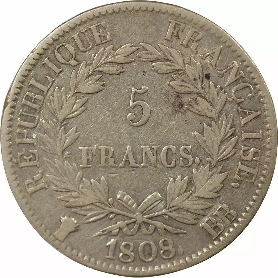 Home > French coins (470 à 2002) > Modern Currencies (1789 to 2002) > 5 Francs > France Napoleon I - 5 Silver Francs, Laureate Head, Republic - 1808 BB Strasbourg
