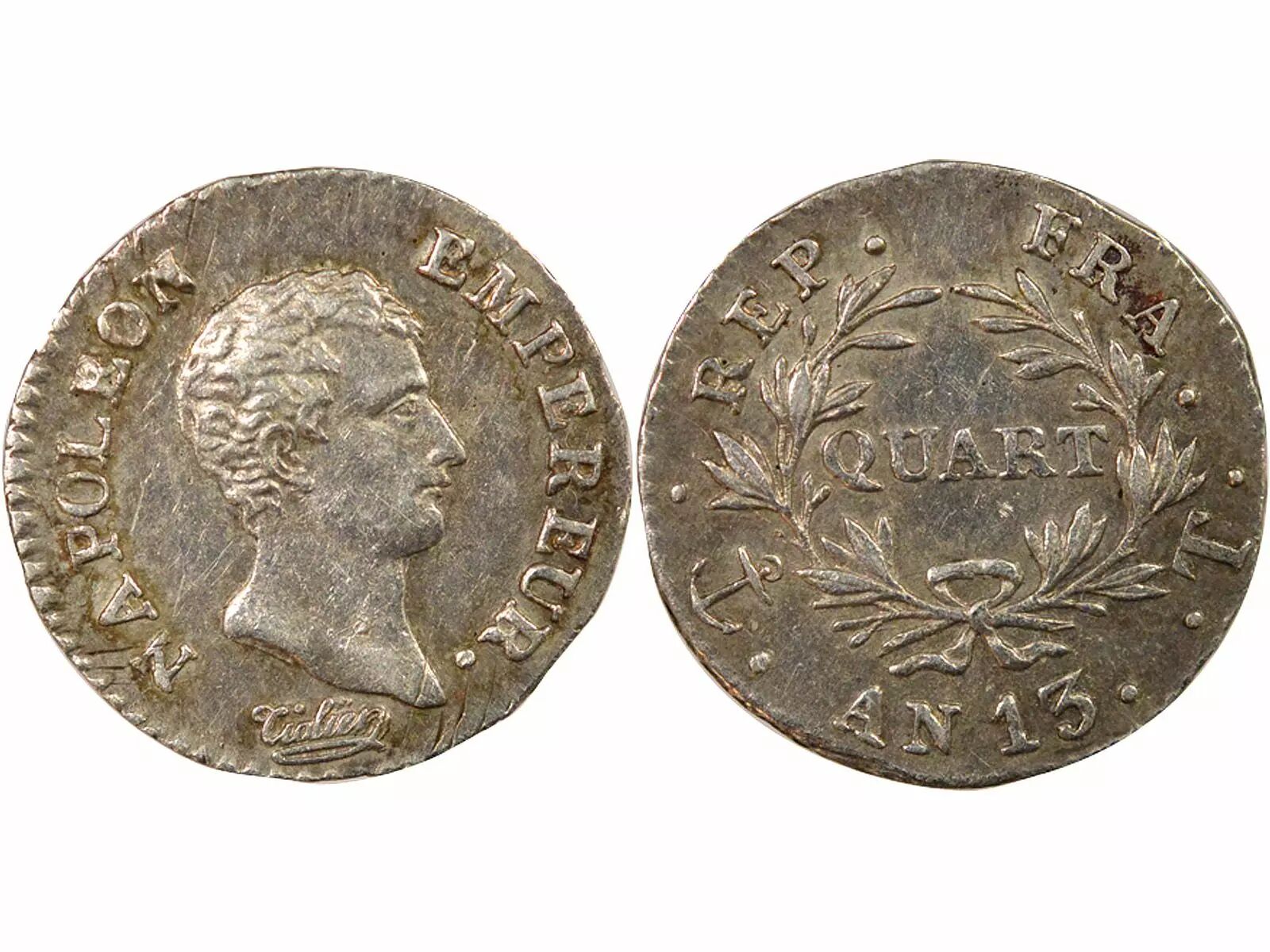 Coin France Napoleon I - Silver Quater Franc, Rev. Calendar - Year 13 T Nantes