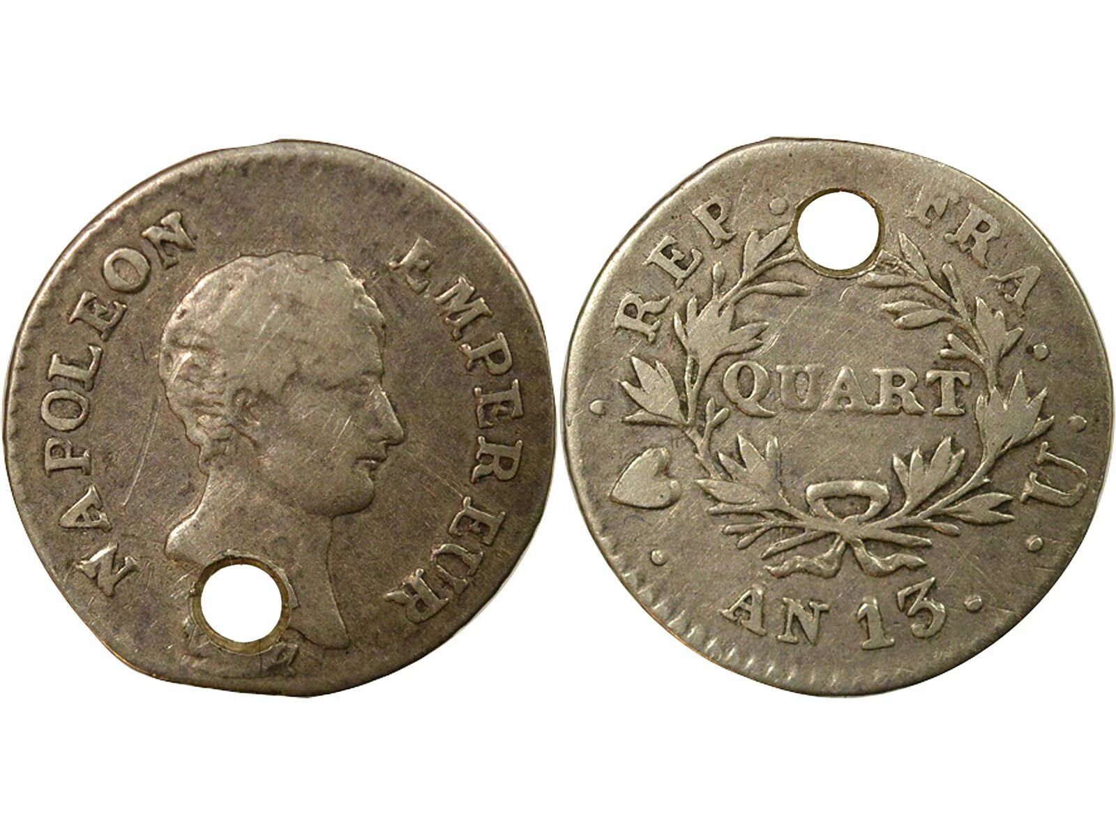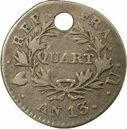Coin France Napoleon I - Silver Quater Franc, Revolutionary Cal. - Year 13 U Turin Pierced