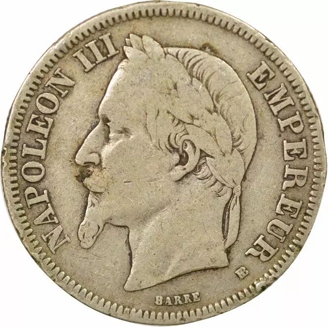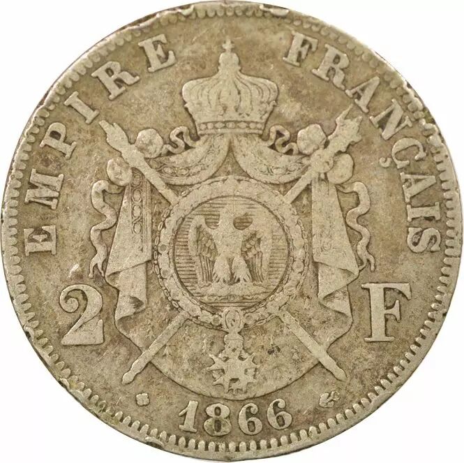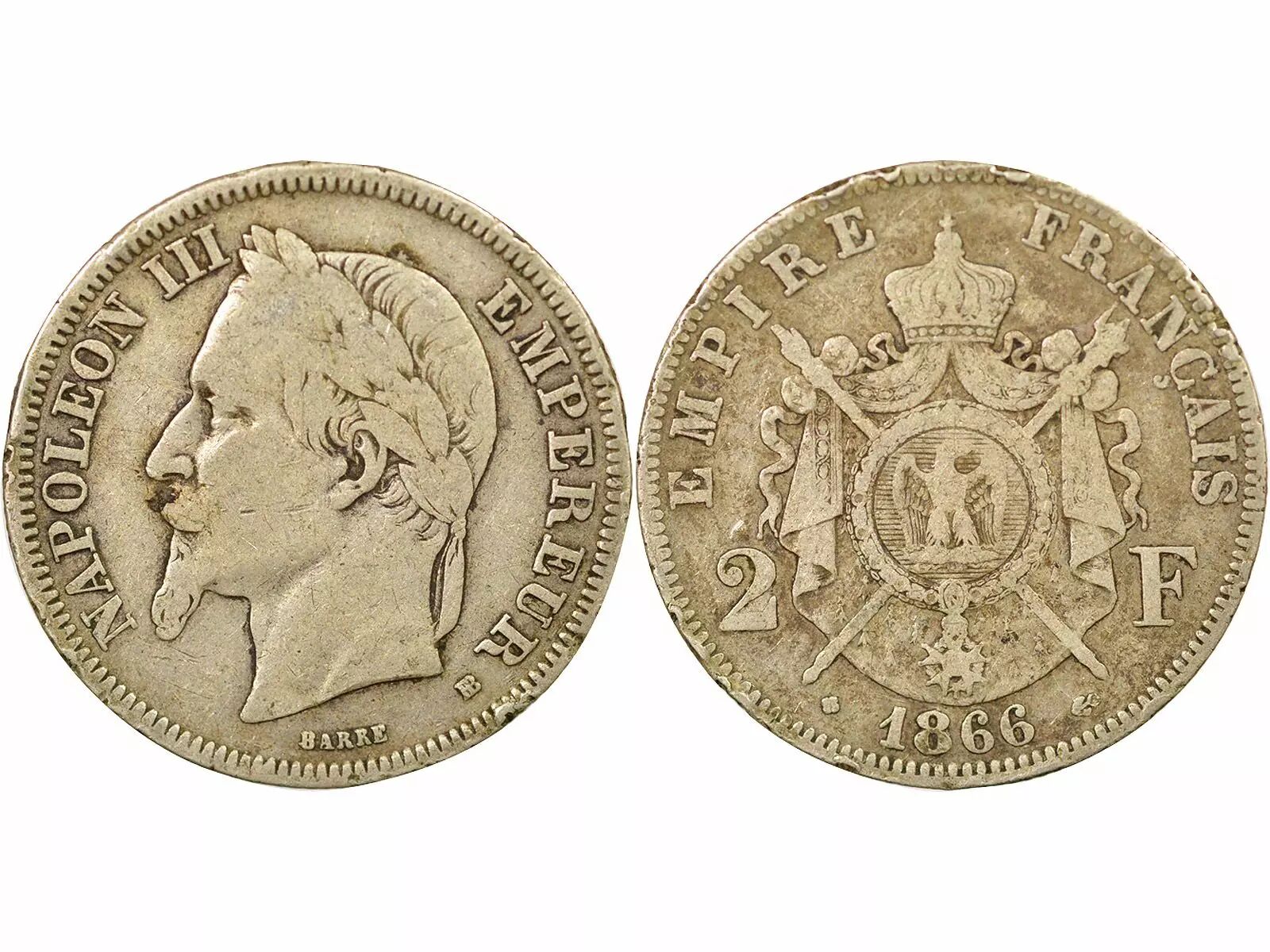 Pièce France Napoléon III - 2 Francs Argent, Tête laurée - 1866 BB Strasbourg