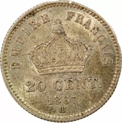 Coin France Napoleon III - 20 Silver Centimes , Big Diameter - 1867 BB Strasbourg