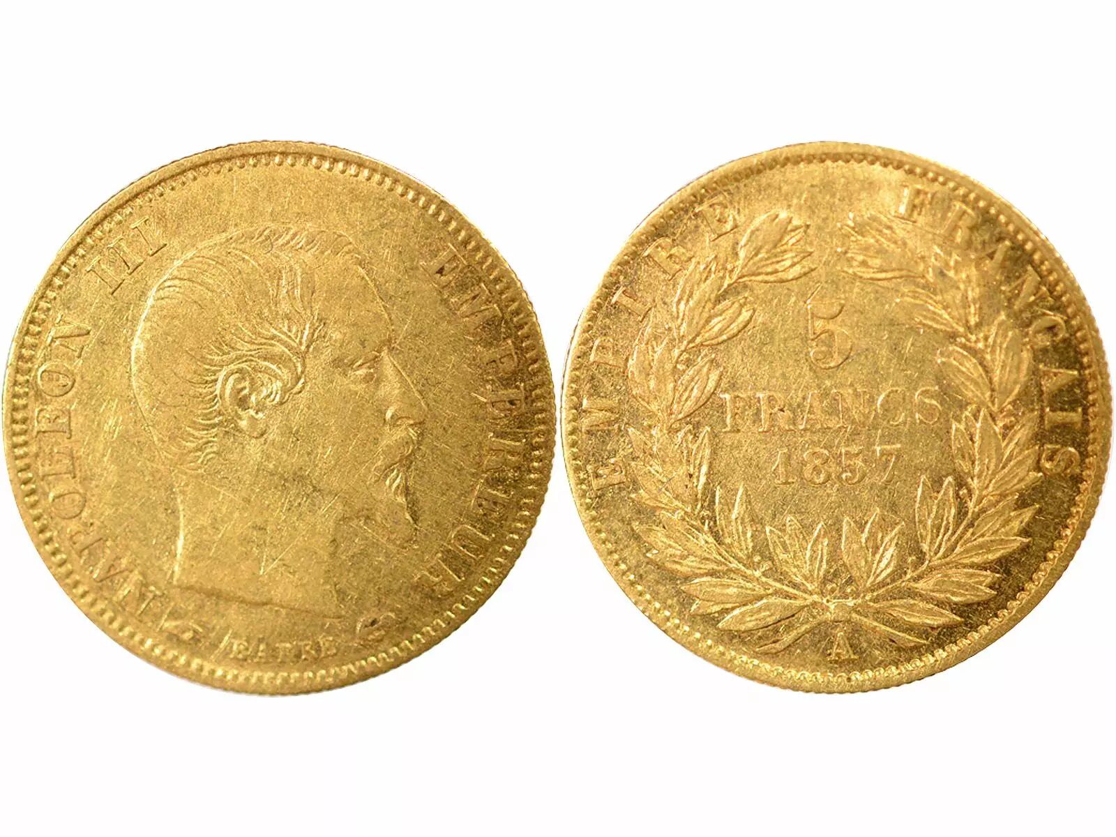Pièce France Napoléon III - 5 Francs Or, Tête nue, Grand Module - 1857 A Paris