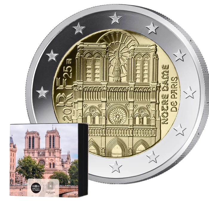 This 2 euro commemorative coin, issued by France in 2025, celebrates Notre-Dame de Paris. The coin is struck with a Proof quality (BE).