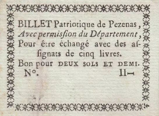 Billet Patriotique - 1792 Pezenas comptait 2.004 habitants en 1792. Tâches d'impression, plis, bel aspect, colle au verso