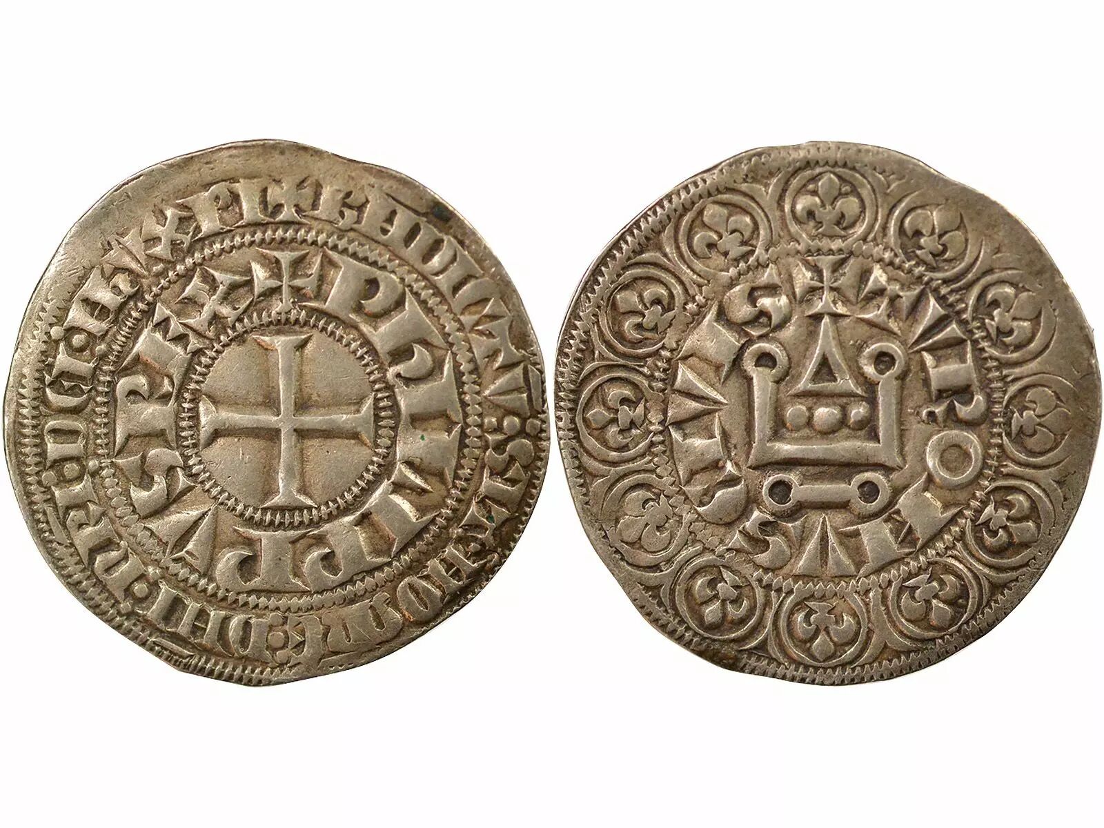 Avers : + PhILIPPVS REX / + BNDICTV : SIT : Nome : DNI : nRI : DeI : I-hV : XPI