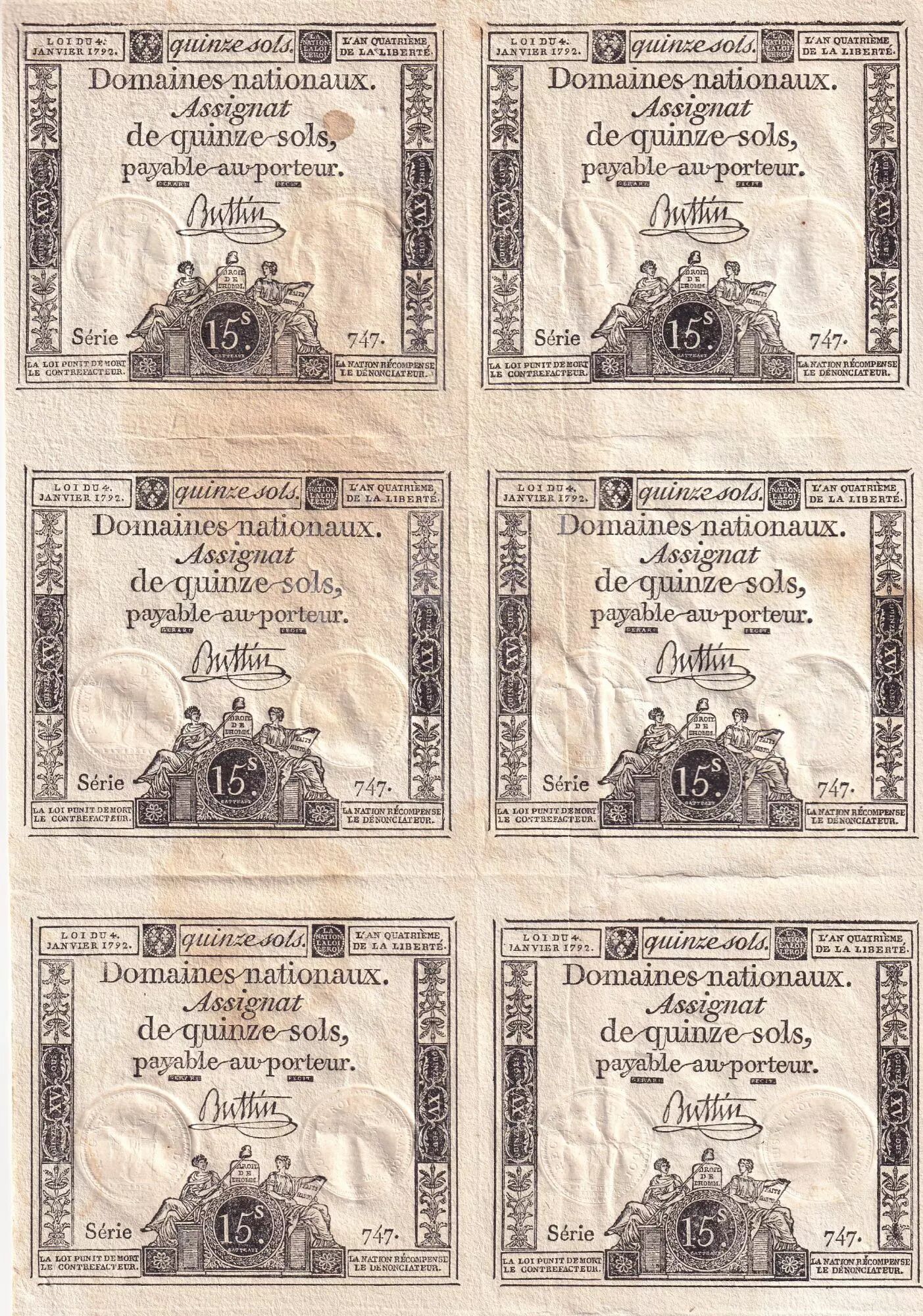 Billet France Planche - 6 X15 Sols - Femmes, bonnet frigien - 04-01-1792) - Série 747 - Sign. Buttin