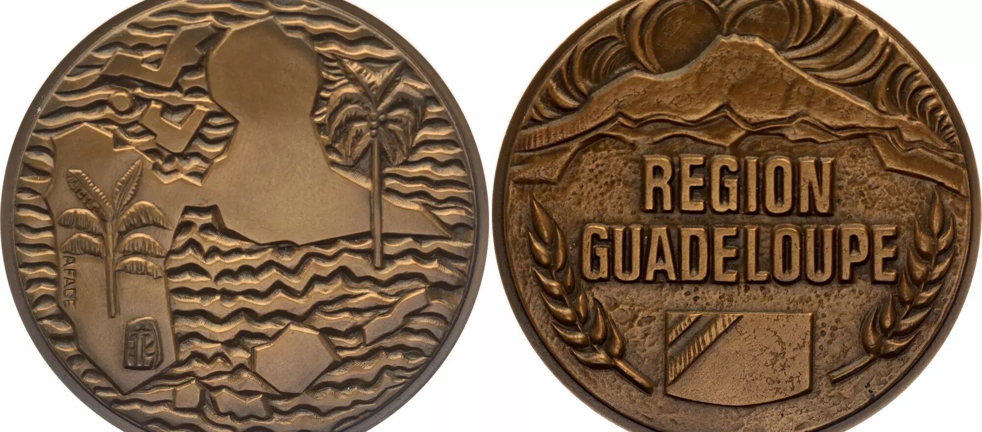 This bronze medal, minted by the Paris Mint in the 1980s, represents the Guadeloupe region. It is an unawarded issue, meaning it was not specifically awarded to a particular person or event.