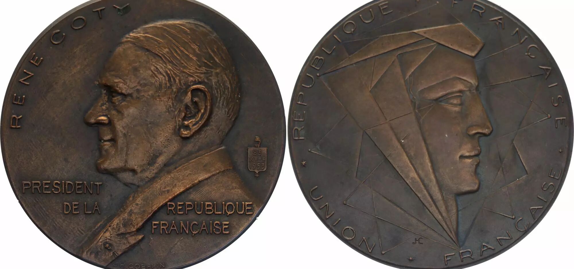 The bronze commemorative medal of René Coty, created by J.H. Coeffin, is a work of the Monnaie de Paris (Paris Mint). Josette Hébert-Coëffin (1906-1973), the engraver, marked her era with her talent and technique, leaving a significant imprint in the field of medal making. The edge of the medal bears in relief the national motto: LIBERTE EGALITE FRATERNITE.