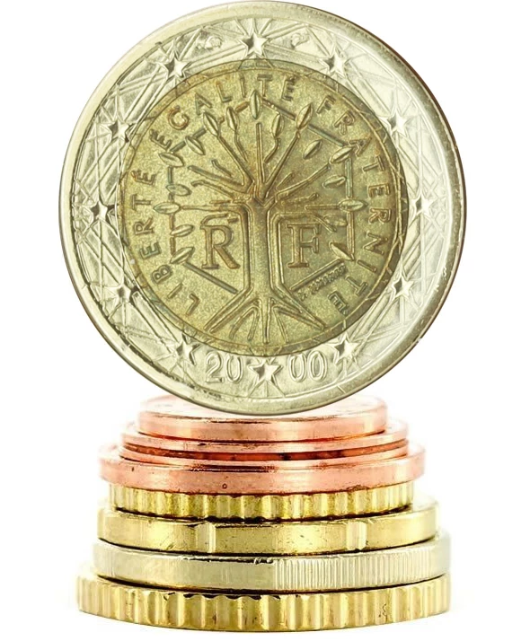 The 1 and 2 euro coins are bimetallic. The 1 euro coin is composed of a cupronickel center and a maillechort ring. The 2 euro coin consists of a maillechort center and a cupronickel ring. The design of the national face is a stylized tree, created by Joaquin Jimenez, surrounded by the French motto "Liberté, Egalité, Fraternité". The twelve stars of the European flag are also present.