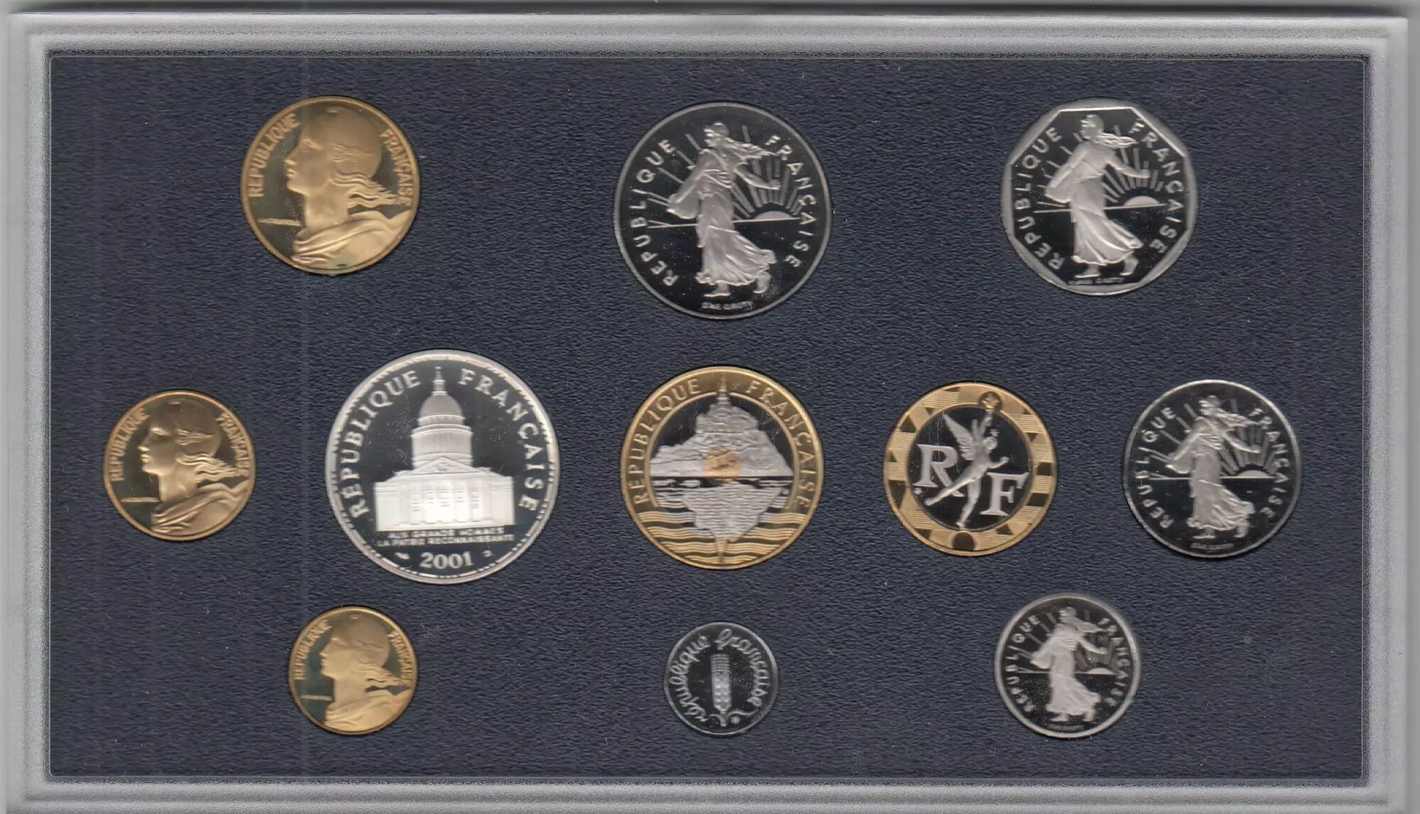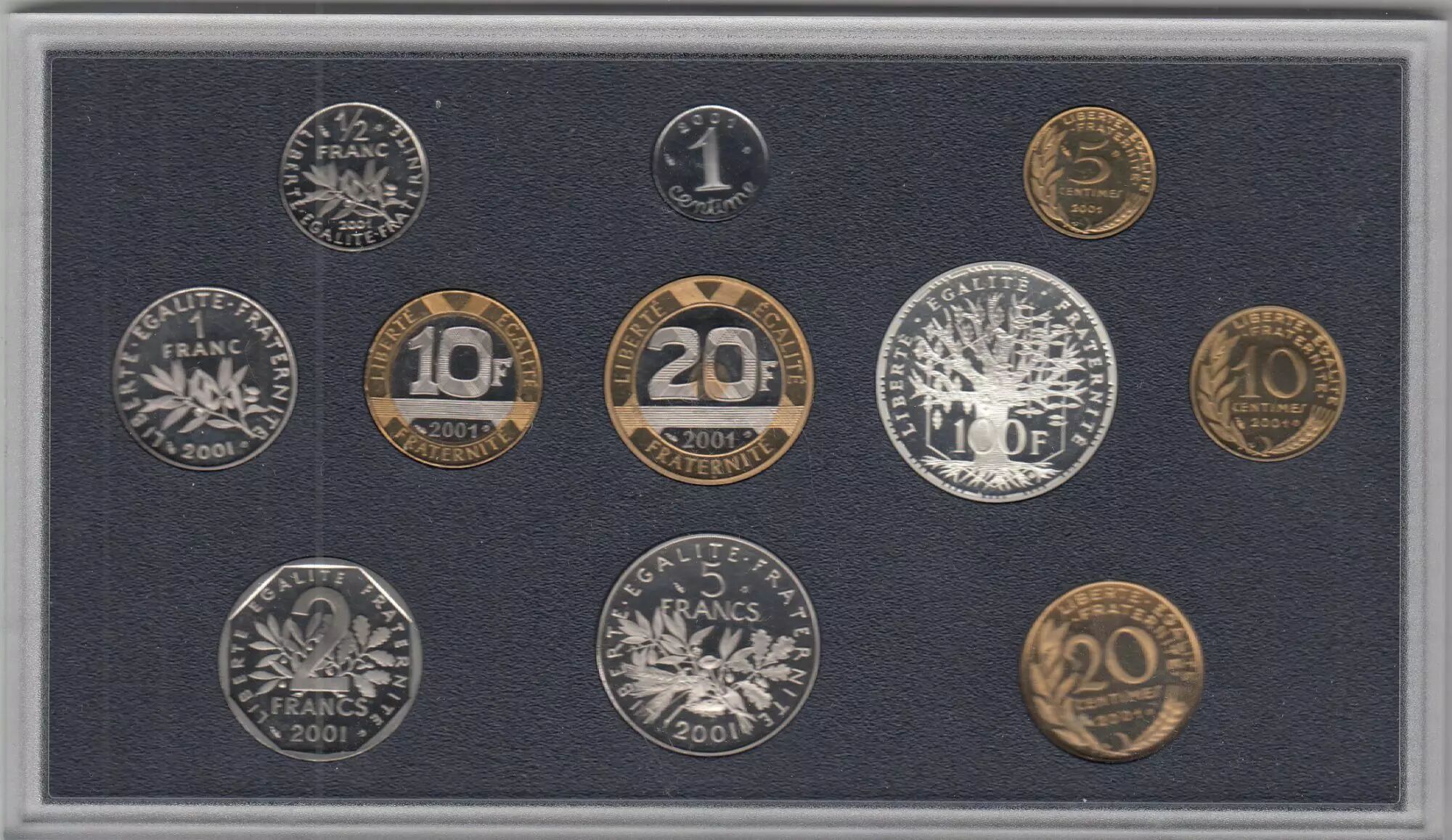 Accueil > Archivage > France Série 11 pièces en francs Belle Epreuve - 2001 - 1 centime à 100 Francs