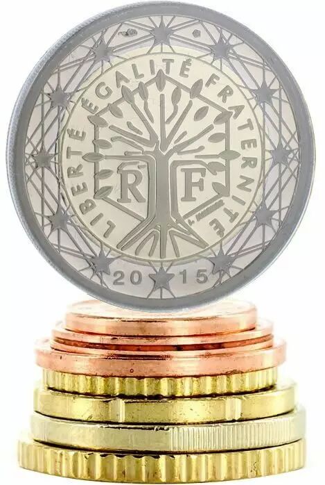 - les pièces de 1 et 2 Euros L'arbre symbole de vie croissance et pérennité figure au centre d'un hexagone. La devise républicaine « liberté égalité fraternité » entoure ce motif.