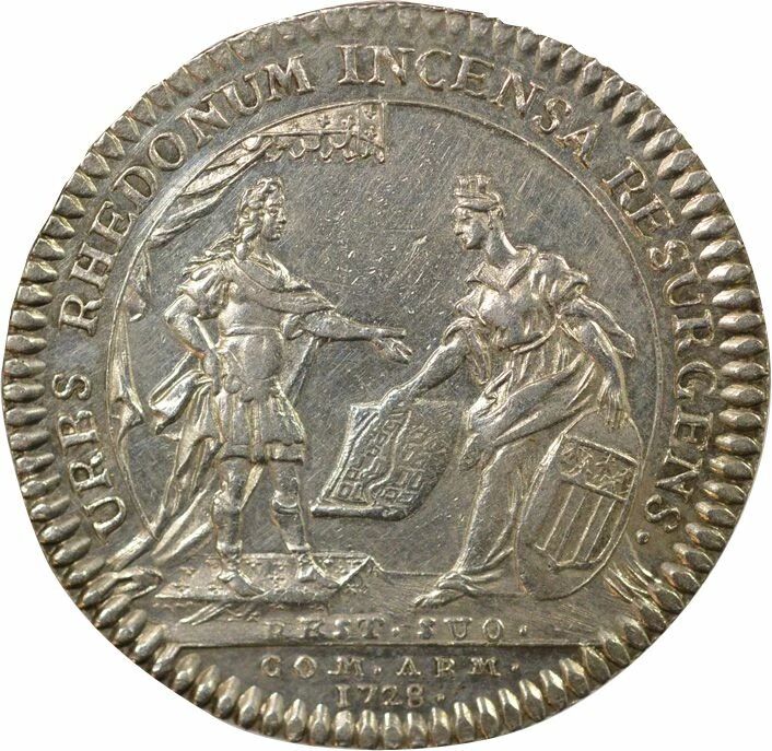 Reverse : URBS RHEDONUM INCENSA RESURGENS . / COM . ARM . / 1728 .