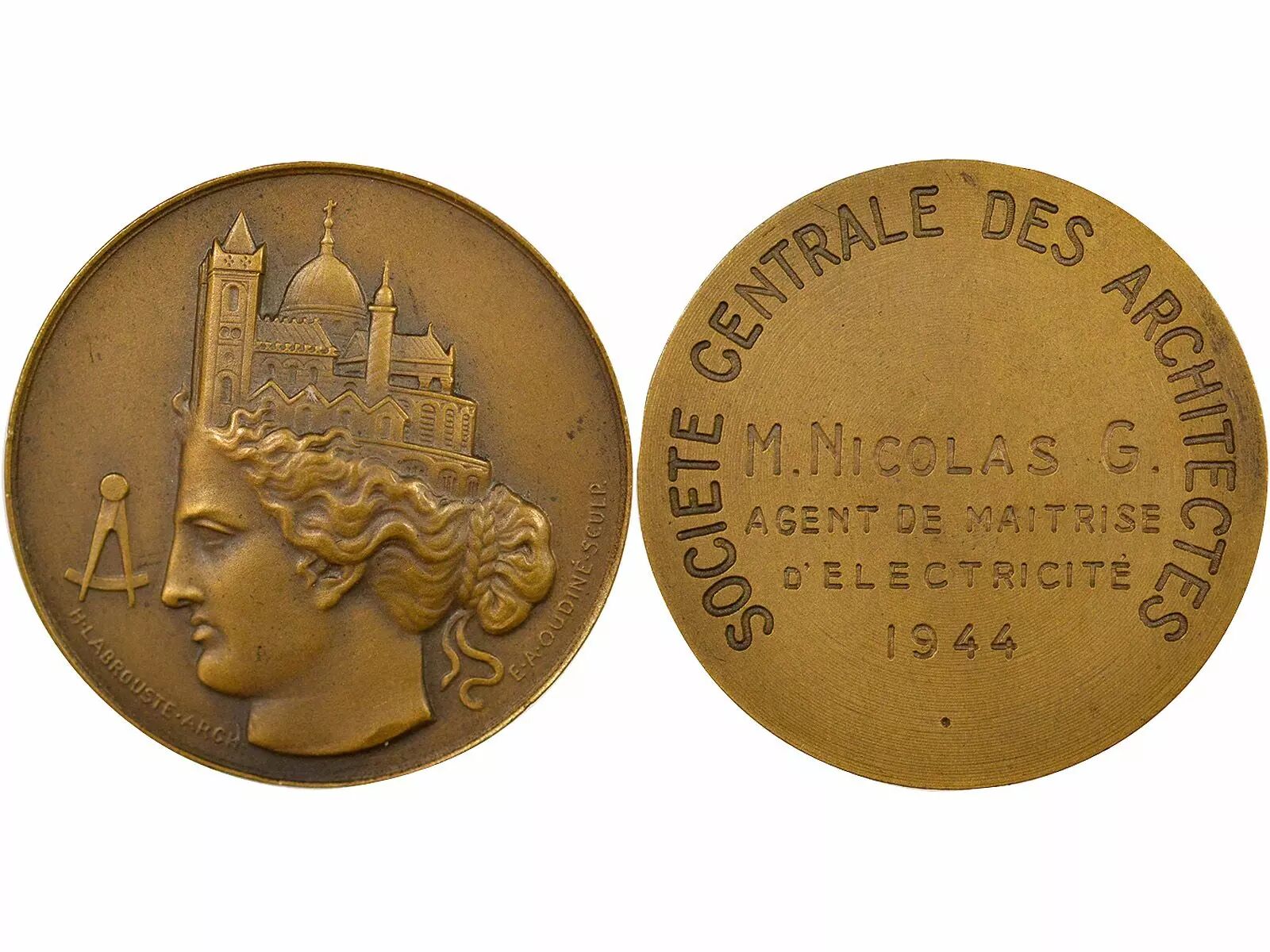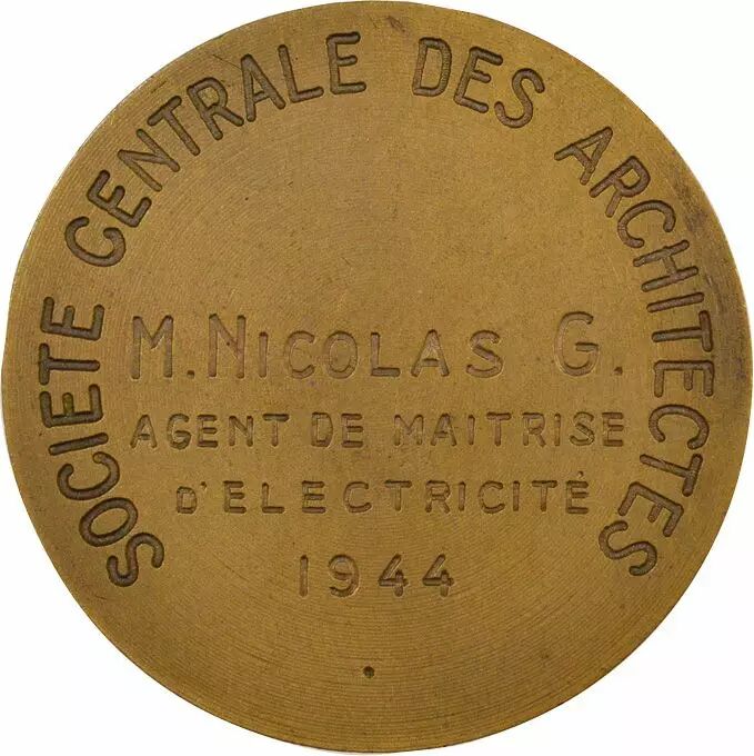 Revers : SOCIETE CENTRALE DES ARCHITECTES / M. NICOLAS G. / AGENT DE MAITRISE / D'ELECTRICITE / 1944