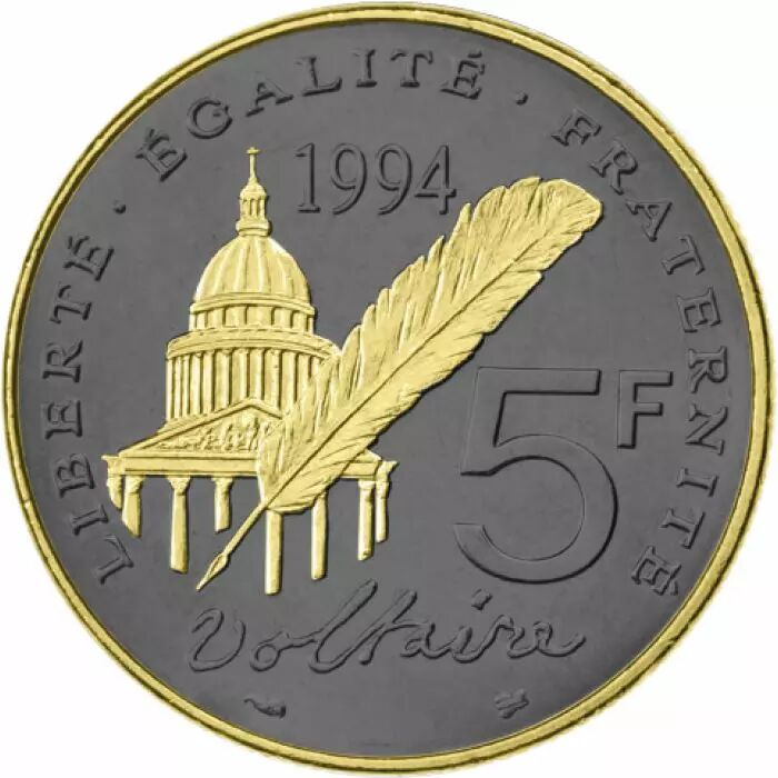 La pièce mythique "5 Francs Voltaire" dans une édition limitée à 200 exemplaires pour le monde entier. Pièce en nickel avec application de ruthénium et or par un institut privé.
