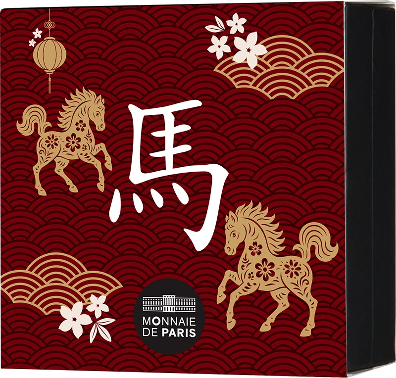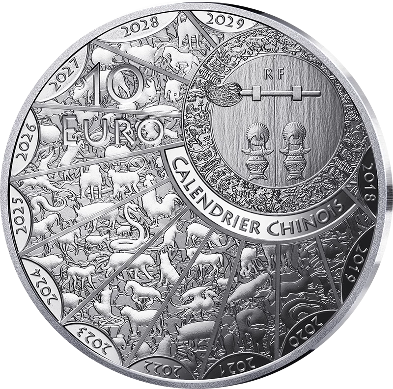 At the center of the coin's face, a horse gallops. It seems to pass through a ring engraved with traditional Chinese motifs. The moving horse recalls the characteristics of those born under this sign: energy, independence, and passion. The year 2026 and the inscription "Year of the Horse" appear on the contours of the design. On the reverse, we find all the animals of the Chinese zodiac spread over a screen surrounding a traditional temple gate. A complete cycle of the Chinese zodiac begins in 2018 and lasts until 2029. Each of these twelve years highlights an animal from this calendar. The face value is visible in the upper left and the mention "RF" is located on the door.