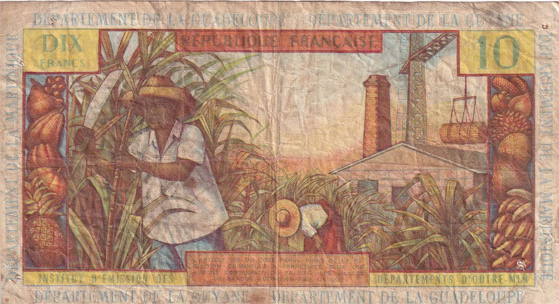 Banknote French Antilles 10 Francs Girl, sugar cane - 1964 - Serial V.5 - P.8b