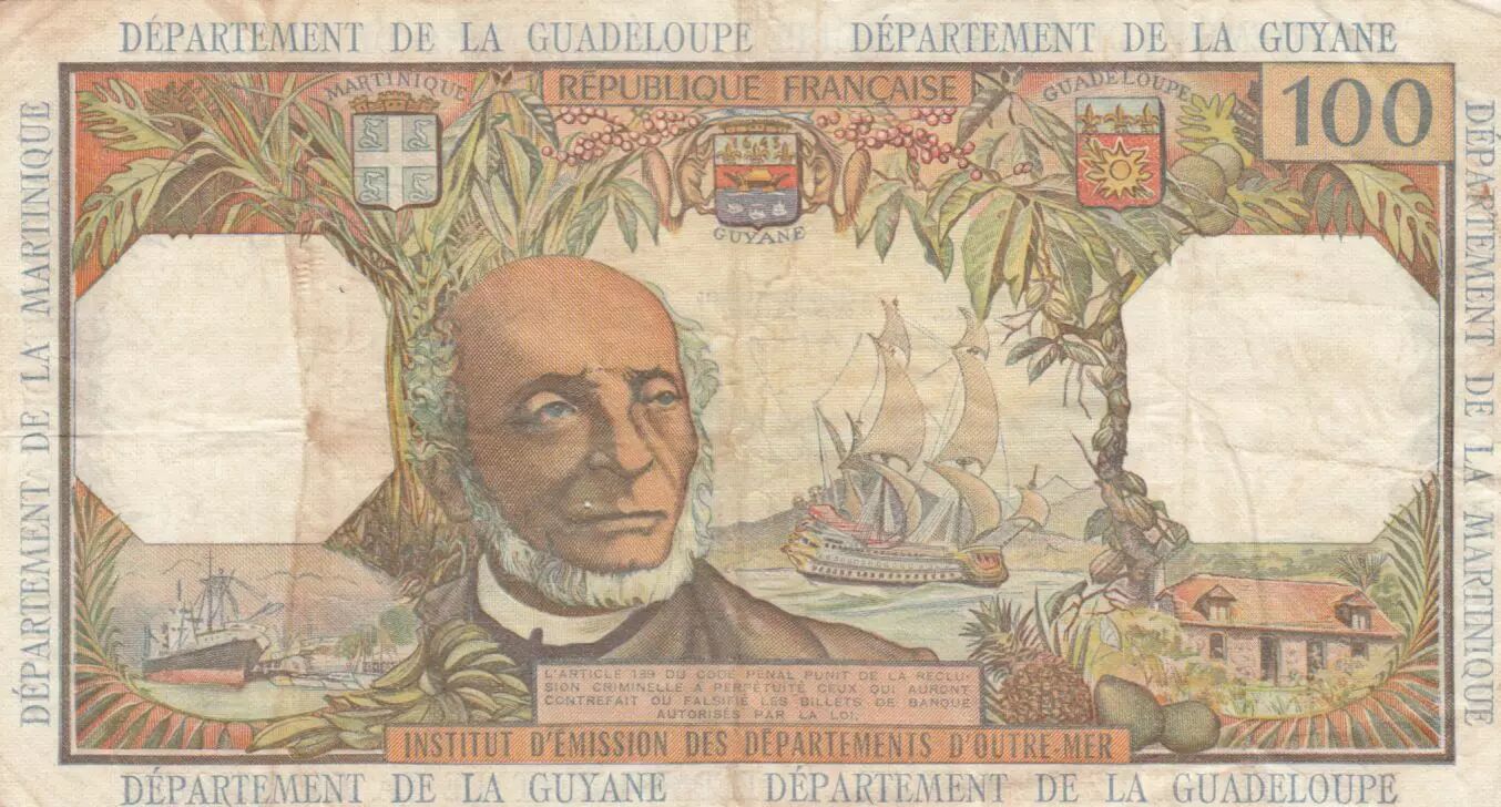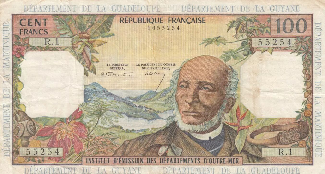 Home > World Banknotes > American Banknotes > French West Indies > French Antilles 100 Francs Victor Schoelcher - ND (1964) - Serial R.1 - VF - P.10a - 1st signatures