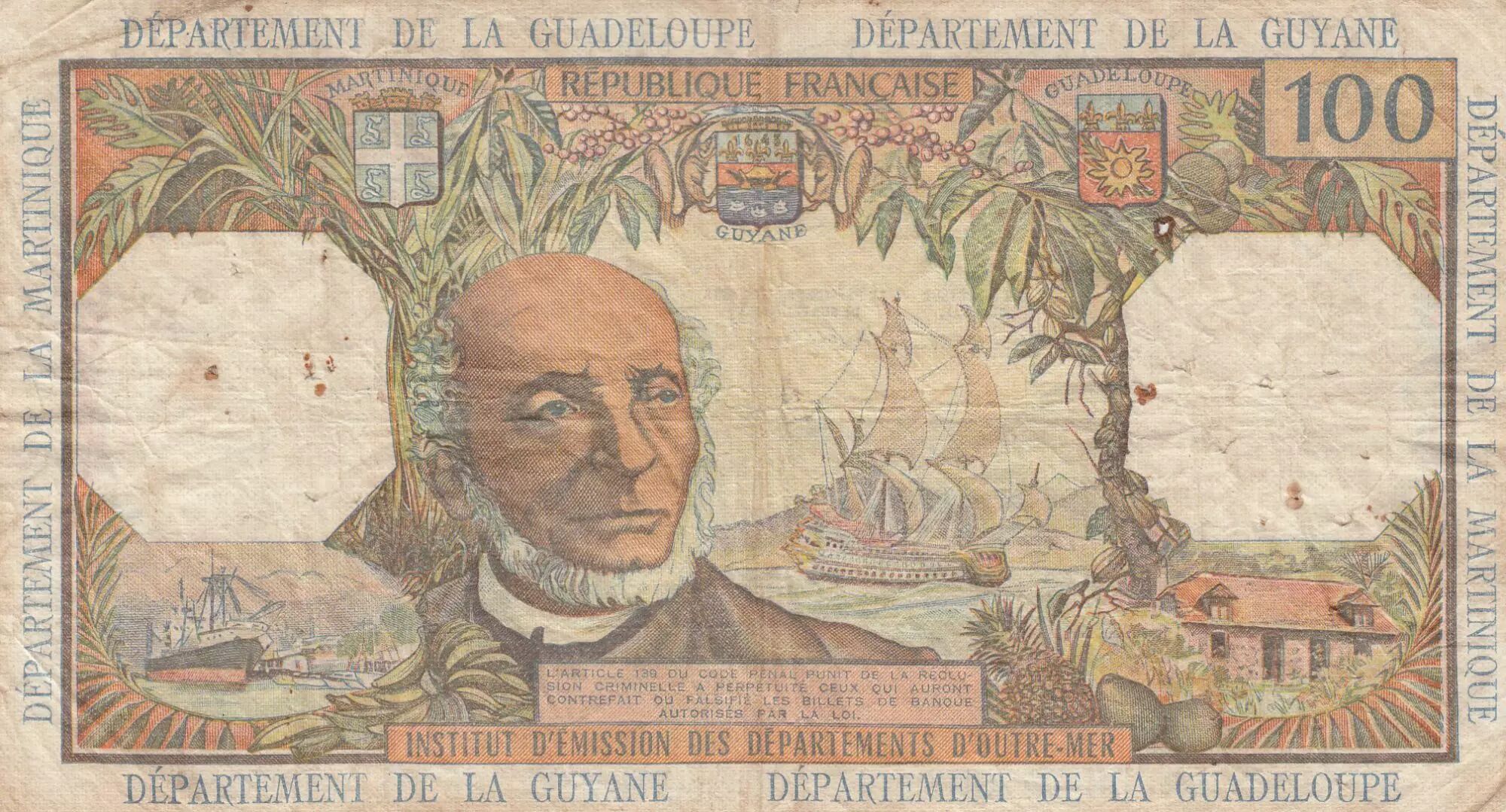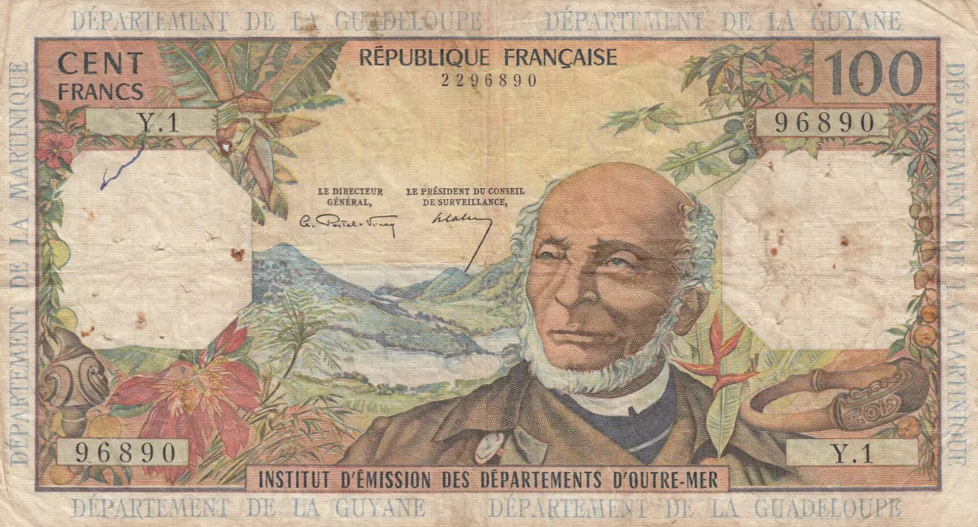 Home > > French Antilles 100 Francs Victor Schoelcher - ND (1964) - Serial Y.1 - F to VF - P.10a - 1st signatures