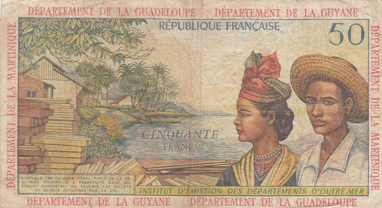 Home > > French Antilles 50 Francs Banana harvest - 1964 - Serial M.1 - F to VF - P.9 a - 1st signature