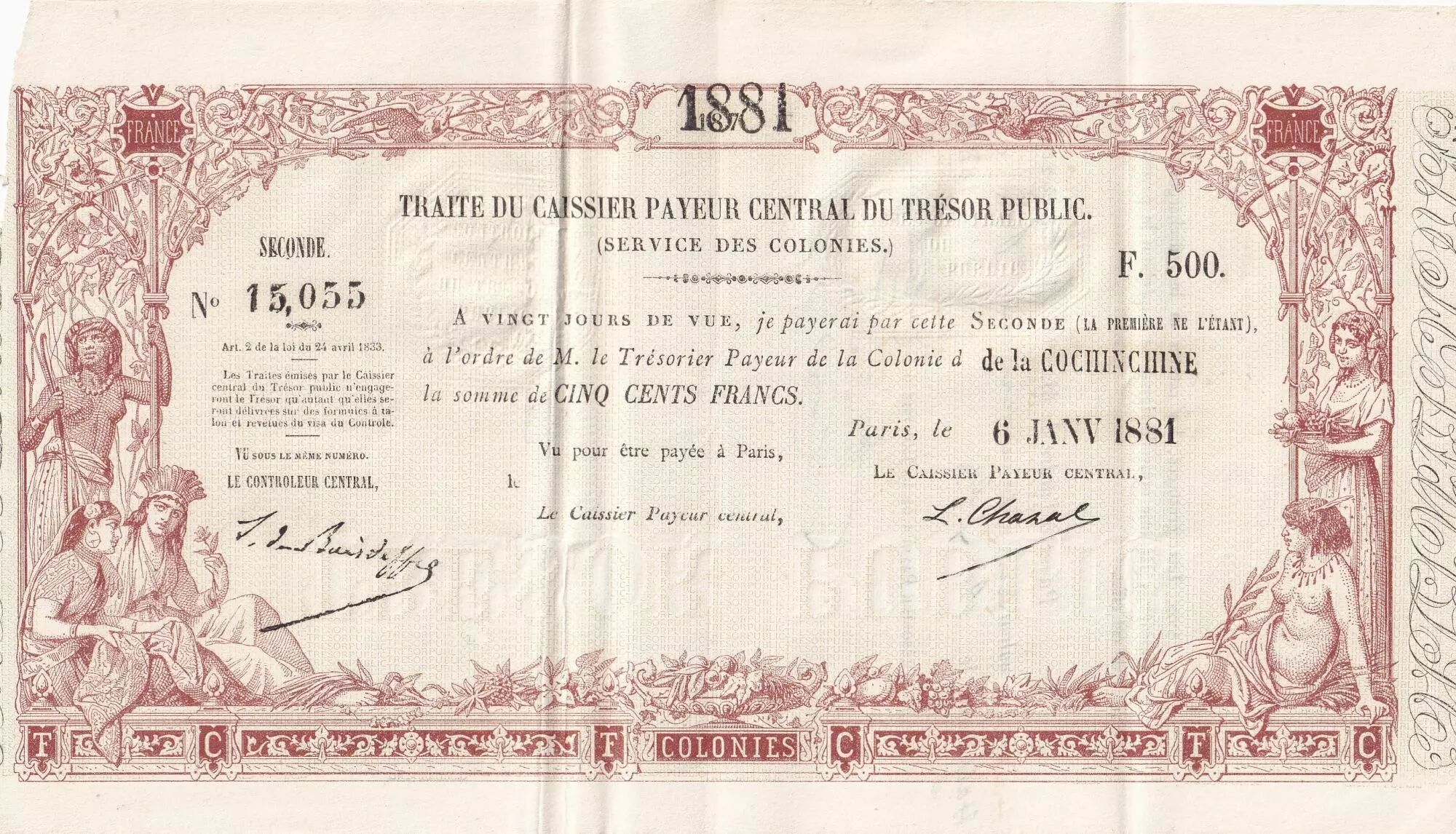 Home > > French Cochin-China 500 Francs - Traite du Trésor Public - Cochinchine - Sign. Chazal - 06-01-1881