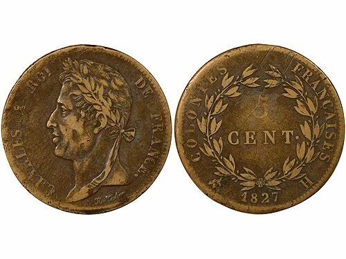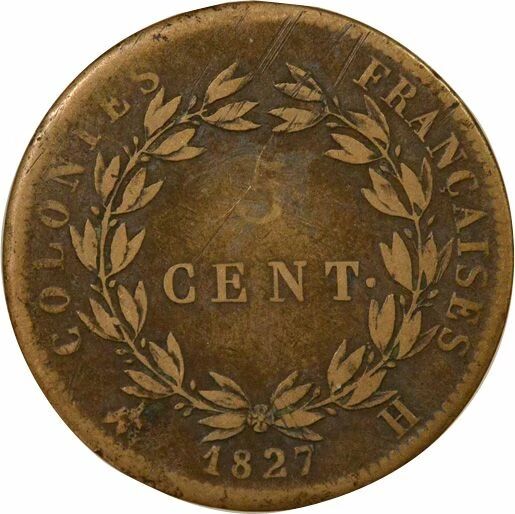 Home > World Coins > Currencies of the Americas > French Colonies > French Colonies Fr. Antilles, Charles X - 5 Centimes - 1827 H La Rochelle