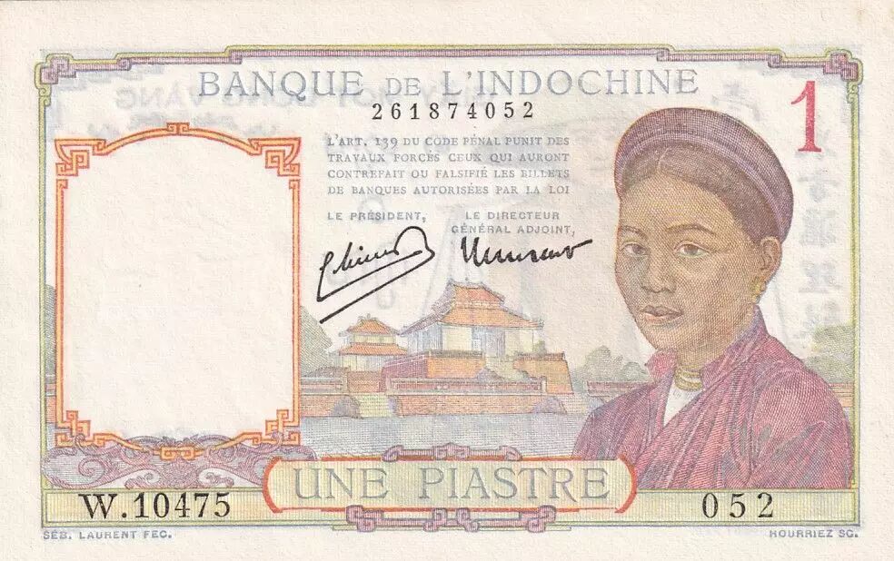 The front of the banknote depicts a woman dressed in traditional clothing. In the background, you can see the tomb of Minh Mang, the second king of the Nguyen dynasty, located in Hue, Vietnam. The face value of the banknote is printed in red. The inscriptions in Latin indicate the issuing institution, "BANQUE DE L'INDOCHINE", as well as the value "UNE PIASTRE". A legal notice reminds of the penal sanctions incurred in case of counterfeiting, in accordance with Article 139 of the Penal Code. The names of the artists who participated in the design of the banknote, SÉB. LAURENT and HOURRIEZ, are also mentioned.