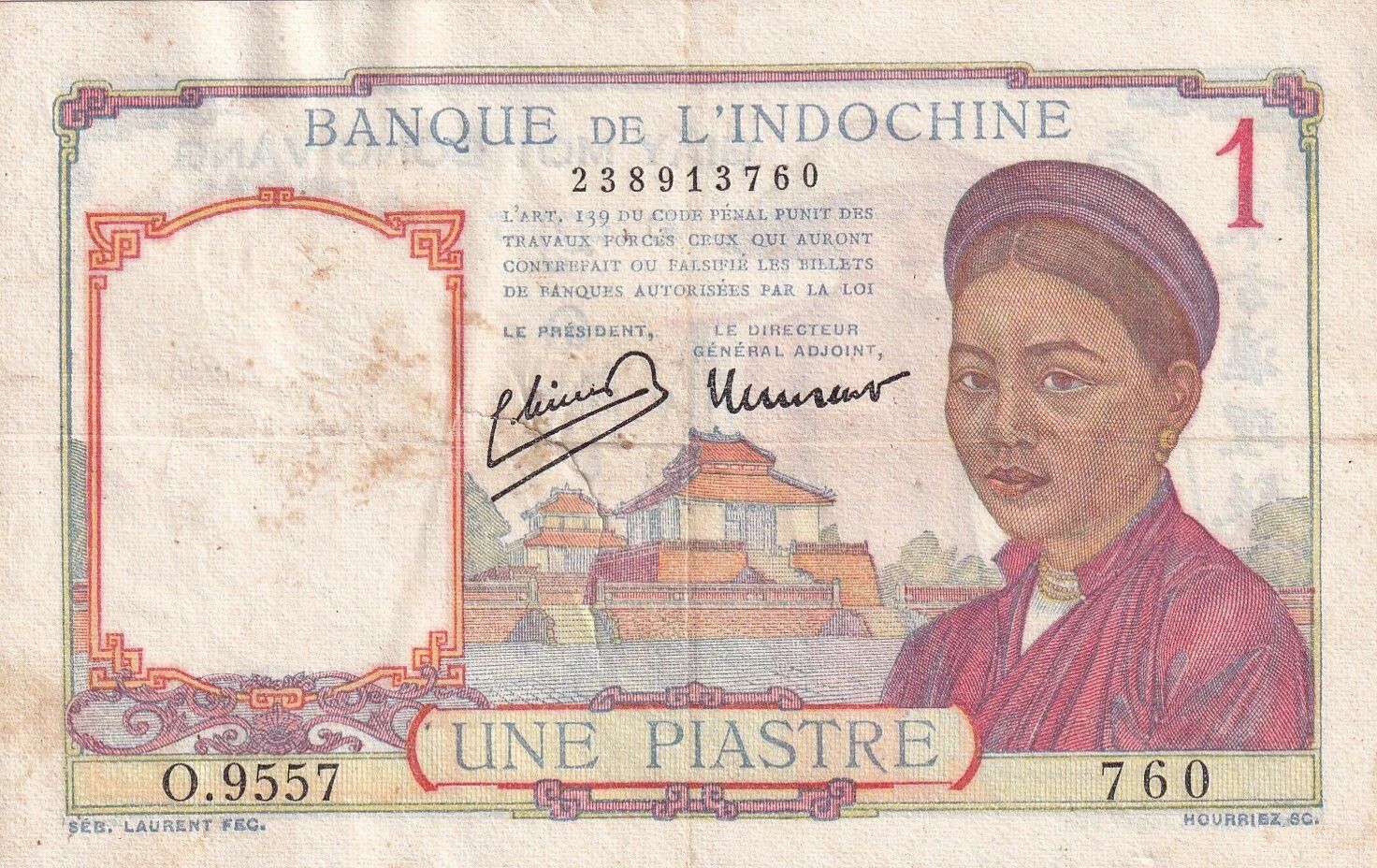 On the obverse, the banknote features a woman dressed in traditional clothing. There is also a representation of the tomb of Minh Mang, the second king of the Nguyen dynasty, located in Hue, Vietnam. The face value "1" is printed in red. The inscriptions include the words "BANQUE DE L'INDOCHINE", the value "UNE PIASTRE", and article 139 of the penal code relating to penalties for counterfeiting banknotes. The names of the artists involved, "SÉB. LAURENT FEC." and "HOURRIEZ SC.", also appear. Georges Hourriez is identified as the engraver and Sébastien Laurent as the designer.