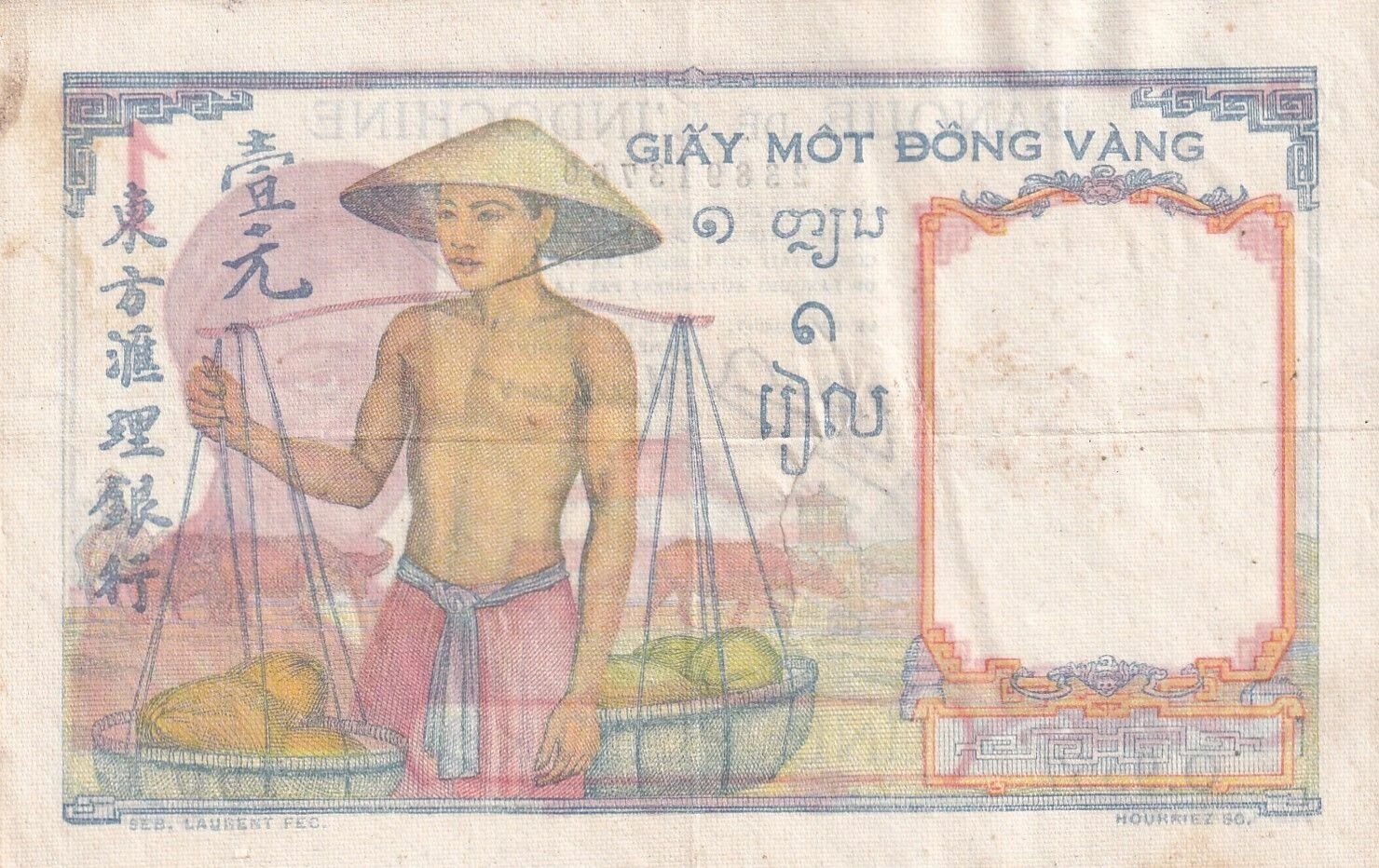 This banknote, with a nominal value of 1 piastre, was issued by the Banque de l'Indochine between 1932 and 1949. It is a specimen from the O.9557 series.