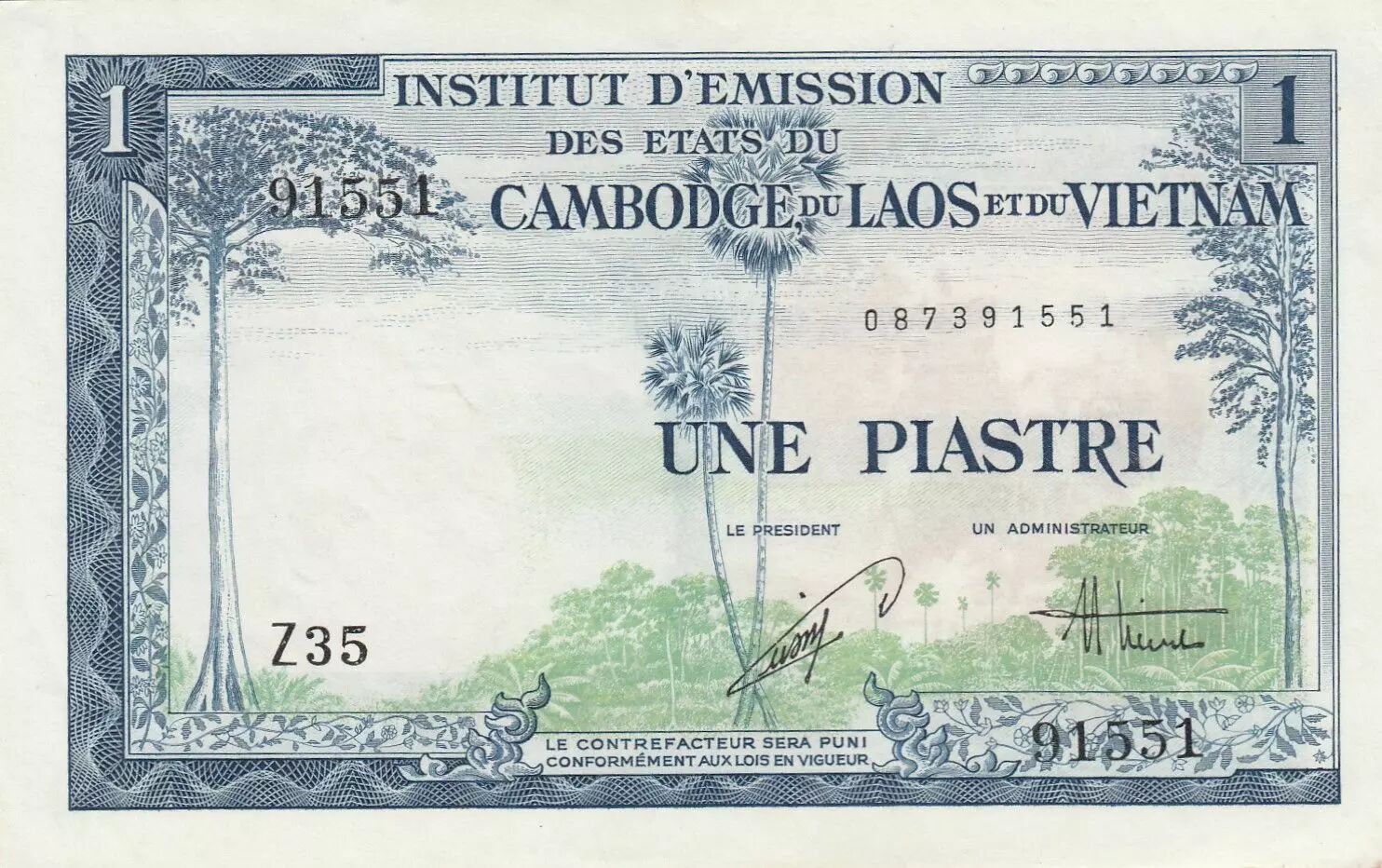 This one piastre banknote, issued in 1954 by French Indochina, is distinguished by its distinct illustrations on the front and back. Its dimensions are 128 mm in length and 80 mm in width.
