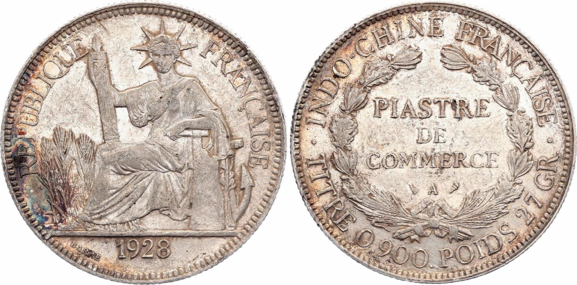 The obverse of the coin features inscriptions indicating the issuing country "Indo-Chine Française" as well as the face value "1 piastre". It also includes the year of issue, here "1928", and the mint mark "A" for Paris.