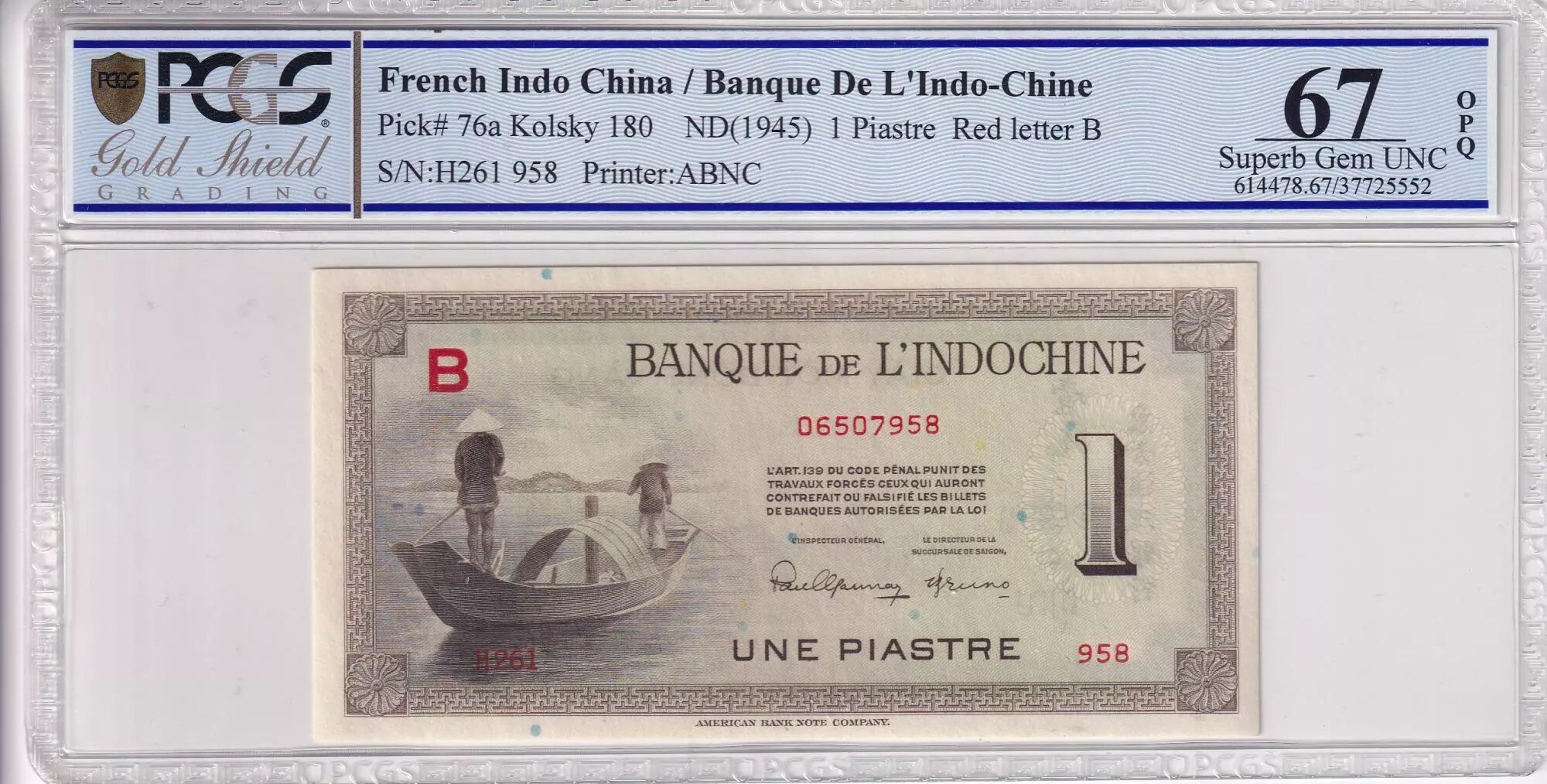 Home > World Banknotes > Asian Banknotes > French Indochina > French Indo-China 1 Piastre - Men with boat - ND (1945) - Letter B - PCGS 67 OPQ