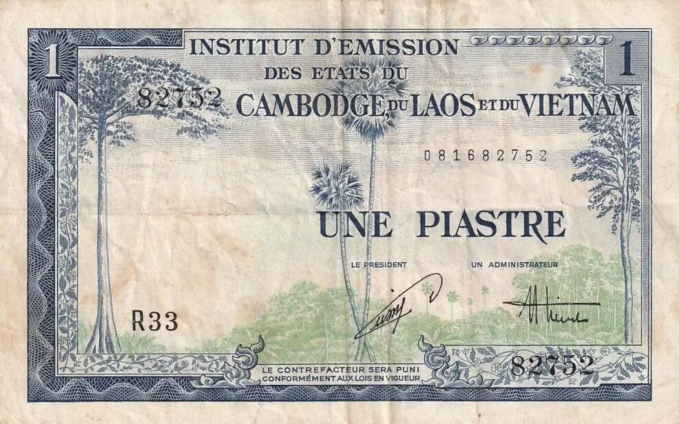 On the obverse, the banknote offers a view of a forest. The inscriptions are in Latin, with the mention "INSTITUT D'EMISSION DES ETATS DU CAMBODGE DU LAOS ET DU VIETNAM" indicating the issuing institution common to these three states. The face value, "UNE PIASTRE", is also written in Latin.