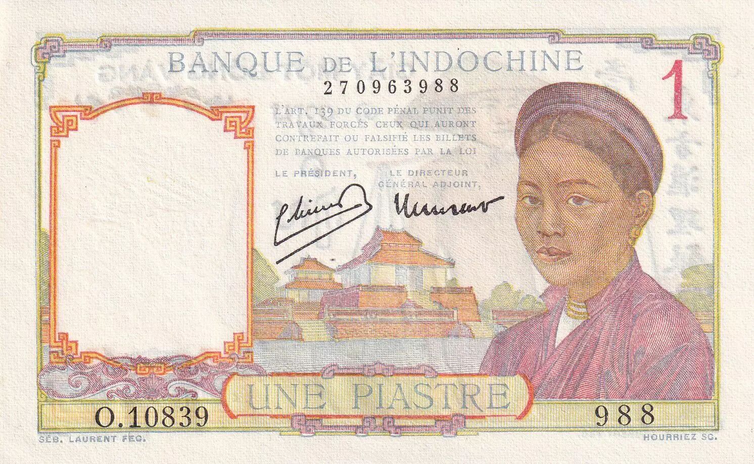 Home > > French Indo-China 1 Piastre - Woman - Temple - ND (1946) - Serial O.10839 - P.54c