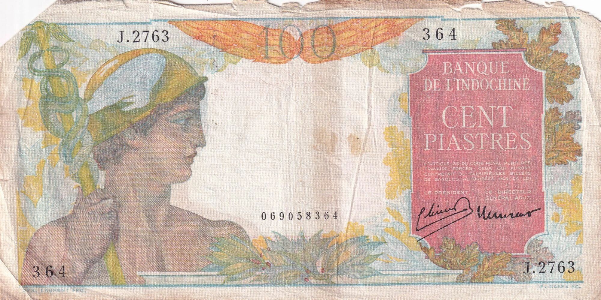 This 100 Piastres banknote constitutes a historical testimony of the French colonial period in Indochina. Its design, incorporating symbolic elements and regional motifs, makes it a collector's item prized by numismatists and history enthusiasts. The absence of weight indication in the information provided suggests that this characteristic is not a central element of its numismatic description.