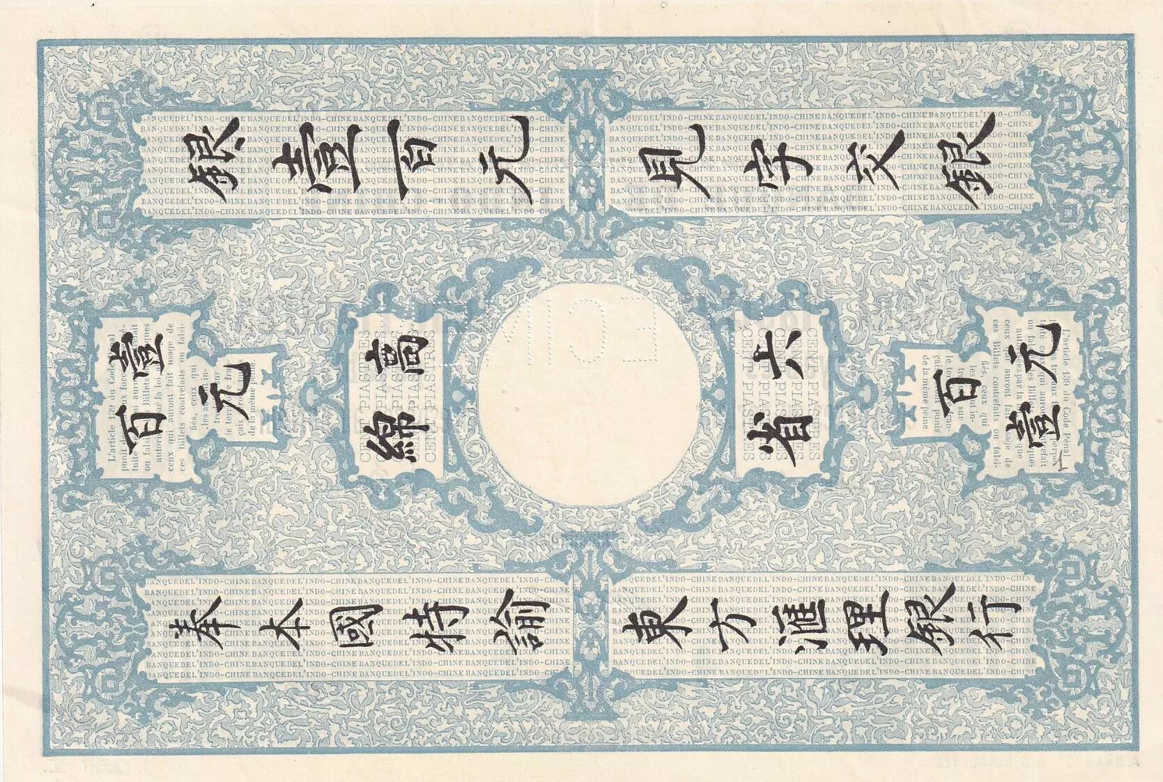 This banknote is a 100 piastre specimen, issued by the Banque de l'Indochine in Saigon in 1903. It falls under the decrees of January 21, 1875, February 20, 1888, and May 16, 1900, which governed the issuance of currency in French Indochina.