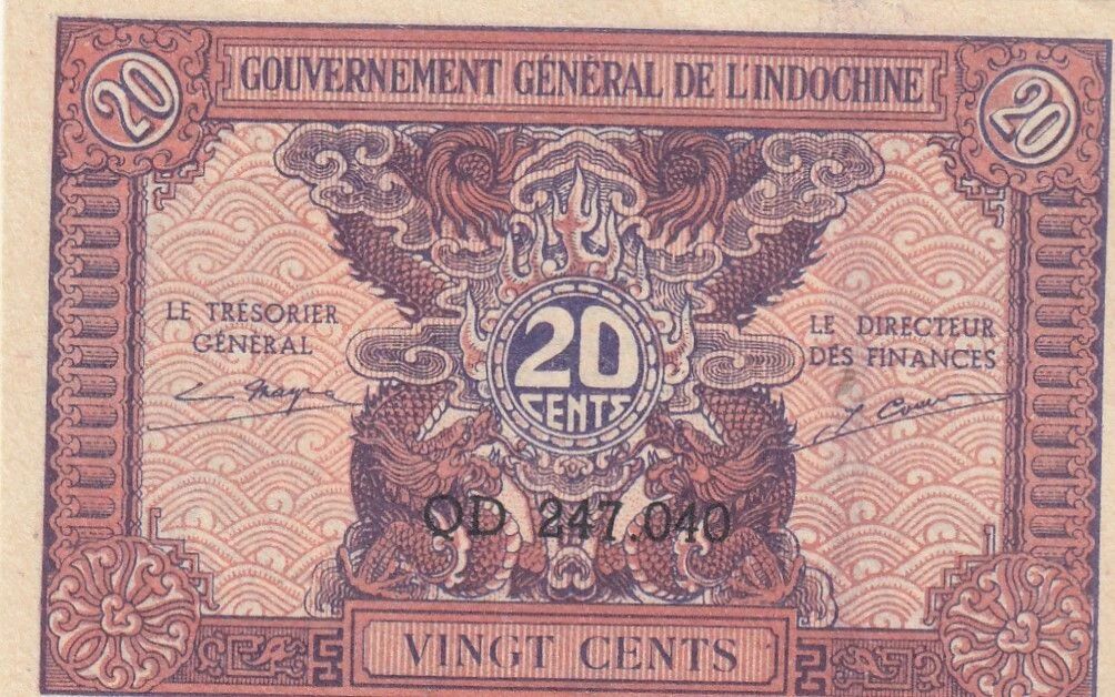 The 20 cent banknote, issued in 1942, comes from the region of French Indochina. This banknote represents a face value of 20 cents, a subdivision of the local currency of the time.