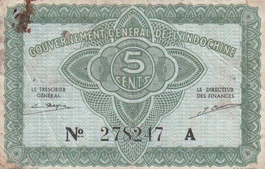The 5 Cent banknote, issued in 1942, comes from the region of French Indochina. It represents a face value of five cents, a monetary subdivision used in that region at that time.