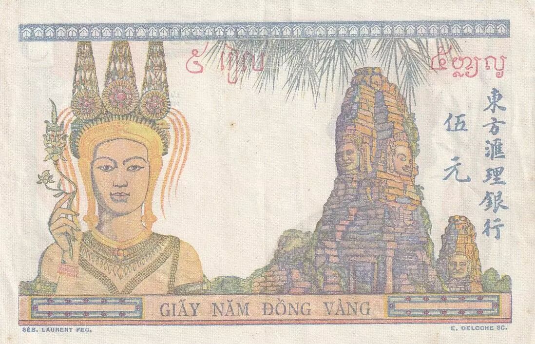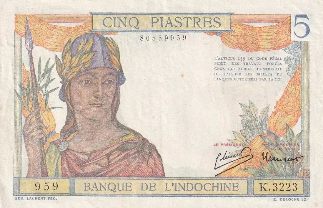 Banknote French Indo-China 5 Piastres - Warrior - ND (1949) - Serial K.3223