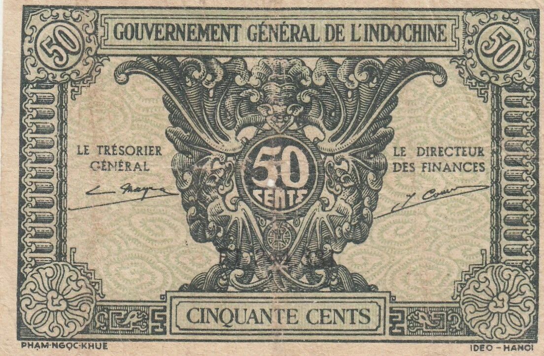 The front of the banknote features motifs and inscriptions in French, the administrative language of French Indochina. The face value, "50 CENTS," is clearly indicated, making it easy to identify the denomination. Ornamental graphic elements frame the text, incorporating symbols and designs typical of the aesthetics of the colonial period. The signatures of those responsible for the monetary issuance are affixed, authenticating the banknote and attesting to its legal validity. The watermark, visible through transparency, enhances the security of the banknote against counterfeiting.