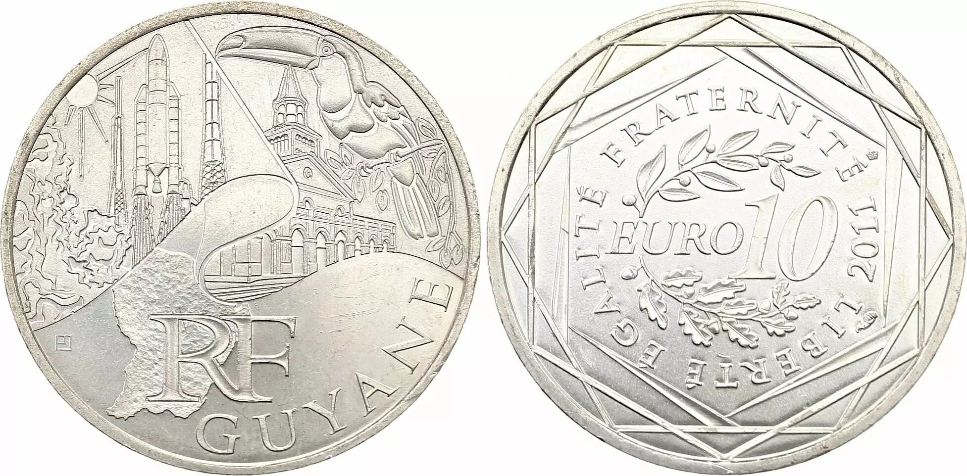 On the face a drawing corresponding to each region appears on a stylised background. The name of each region appears at the bottom of the coin. A graphic reproduction of the regional flag crowns the upper part of the coin. The common reverse side features the €10 face value surrounded by 2 branches, one of oak and the other of laurel, evoking the Euro symbol. The inscription "Liberté Egalité Fraternité" is placed around the edge of the coin and the whole motif is framed by an assembly of lines representing the hexagon.
