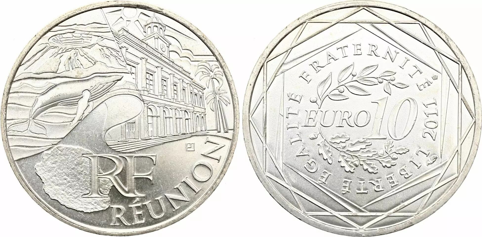 On the face a drawing corresponding to each region appears on a stylised background. The name of each region appears at the bottom of the coin. A graphic reproduction of the regional flag crowns the upper part of the coin. The common reverse side features the €10 face value surrounded by 2 branches, one of oak and the other of laurel, evoking the Euro symbol. The inscription "Liberté Egalité Fraternité" is placed around the edge of the coin and the whole motif is framed by an assembly of lines representing the hexagon.