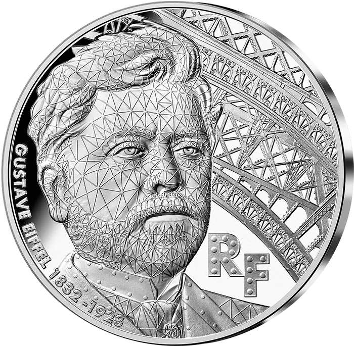 The obverse of the coin features a portrait of Gustave Eiffel in front of an arch of the tower that bears his name. The portrait has been crafted so that the features of his face, hair and clothing are made of rivets, as if Gustave Eiffel were one with the metal structures he conceived throughout his life.