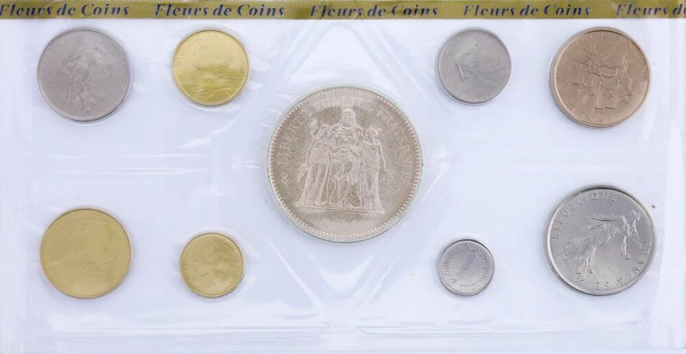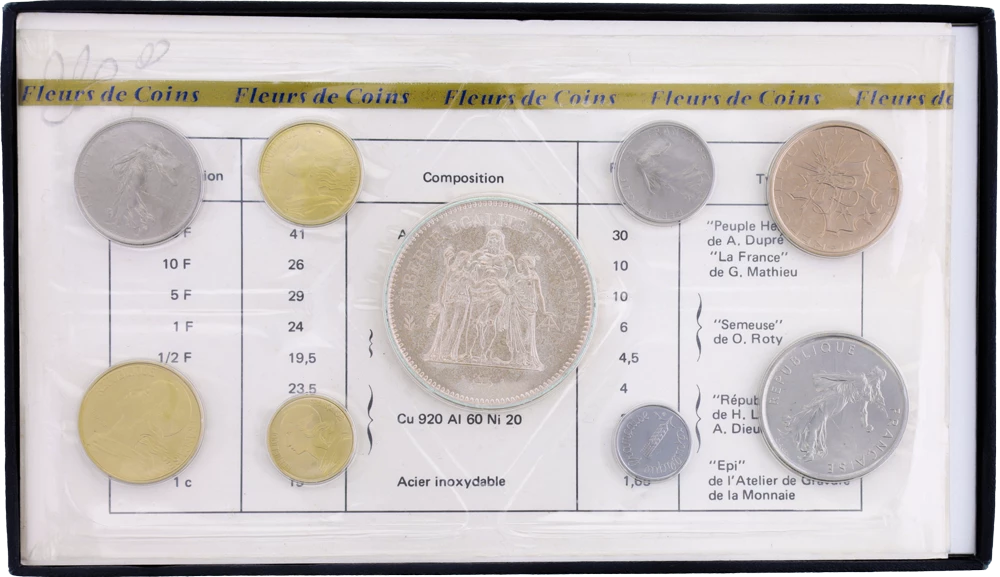 The 1975 FDC Franc set, issued by the Monnaie de Paris (Paris Mint), is a numismatic collection comprising nine distinct coins. The production of this set is limited to 52,000 copies, making it a sought-after collector's item.