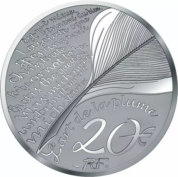 The reverse side is common to the entire series "The Art of the Pen." Several emblematic quotations are inscribed, such as "The best is the enemy of the good" by Voltaire, "Lasciate ogne speranza voi ch’intrate" by Dante Alighieri, "To be or not to be: that is the question" by William Shakespeare, or "What does not kill me makes me stronger" by Nietzsche. A quill is engraved in the center of the coin. Below it is the title of the series. The mention "RF" is present at the bottom right of the coin, as well as the hallmark of Joaquin Jimenez and the engraving workshop