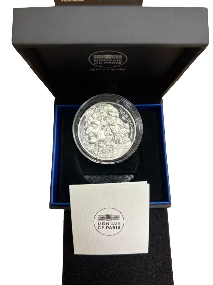 Also visible on the coin is the Château de Vaux-le-Vicomte, a nod to La Fontaine's friendship with Nicolas Fouquet, the then owner of the castle. His dates and the name of Jean de La Fontaine, as well as the coat of arms of Château-Thierry, his birthplace where he spent part of his life and which inspired him with the animals of his fables, are engraved to the right of the design.