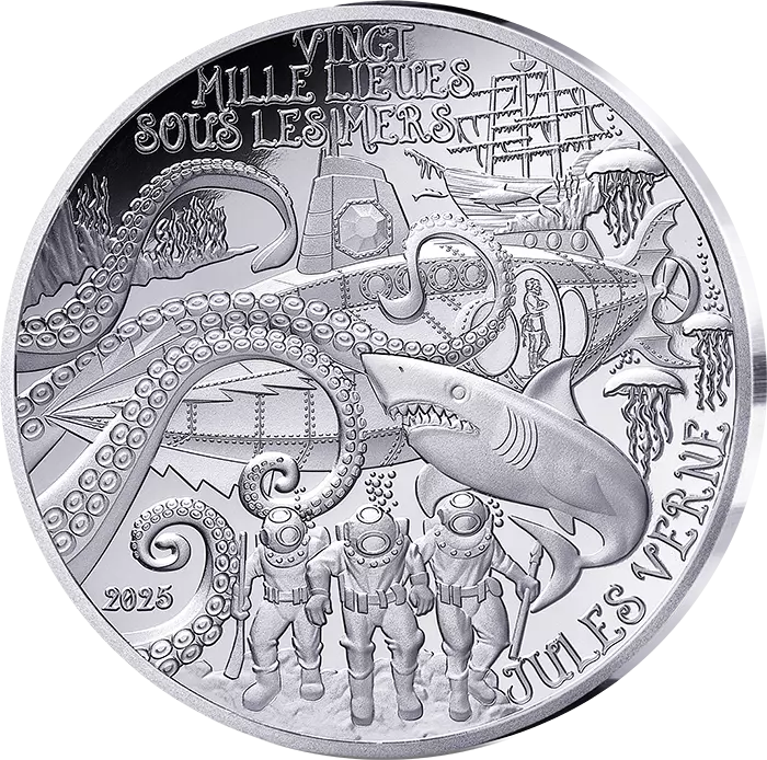 On the front of this coin, emblematic elements from the novel Twenty Thousand Leagues Under the Sea are displayed, evoking the marine world. Captain Nemo, aboard the famous Nautilus, is in the centre, behind the tentacles of a giant squid. Beneath the shark, three divers move forward in search of treasure. In the background, the wreck of an ancient ship symbolises the characters' underwater adventures. The title of the novel, Twenty Thousand Leagues Under the Sea, the author's name, Jules Verne, and the year 2025 are also featured.